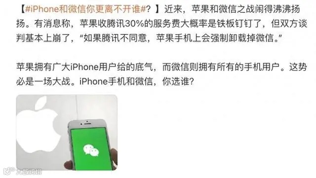 双方分歧的焦点主要在微信小游戏的分成上。公开资料显示,苹果要求腾讯在小游戏中屏蔽外部支付服务的链接。它希望这家中国公司停止开发者使用平台内置的消息传递将玩家引导至其他支付门户,从而避免支付苹果通常约30%的分成(即“苹果税”)。苹果还曾要求该公司完全禁用游戏中的消息传递,但腾讯认为这太过激进而拒绝了。(观察者网)