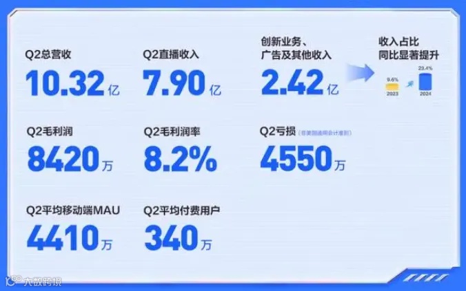 2024年第二季度,斗鱼移动端季度平均MAU为4410万,付费用户数为340万。平台总营收10.32亿元,毛利润8420万,毛利率8.2%,本季度斗鱼录得净亏损4920万元,调整后净亏损为4550万元,环比亏损大幅收窄。与此同时,创新业务、广告及其他收入为2.42亿元,公司收入结构进一步优化。(封面新闻)