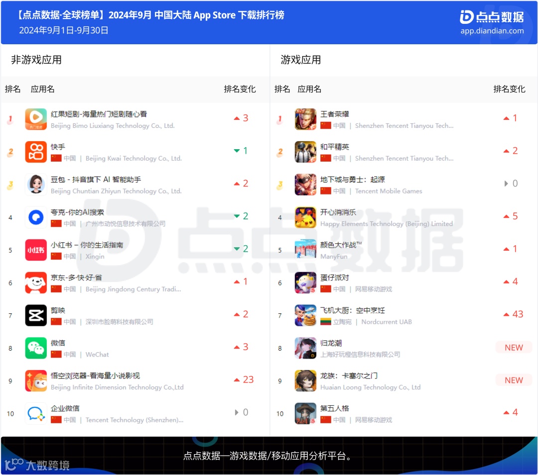 腾讯MOBA竞技手游《王者荣耀》重返手游下载冠军,九月App Store下载量超过475万;立陶宛模拟空中送餐游戏《飞机大厨:空中烹饪》领衔掀起食品服务题材游戏走红;国潮动作手游《归龙潮》与祖龙《龙族:卡塞尔之门》新晋登榜。