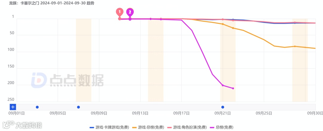 9月10日,祖龙自研自发的卡牌RPG游戏《龙族:卡塞尔之门》上线发布并于12日正式开启公测。点点数据显示,产品公测当日便登顶游戏总类及所属类别游戏免费榜并于此后的一周内持续霸榜,且截止到9月底,该游戏在卡牌游戏及角色扮演游戏类别免费榜的排名持续稳定在前十五之内。畅销榜成绩方面,该作继上线以来直到月底的排名趋势则相对稳定,其在所在类别游戏畅销榜的排名也能稳定在前十之内。
