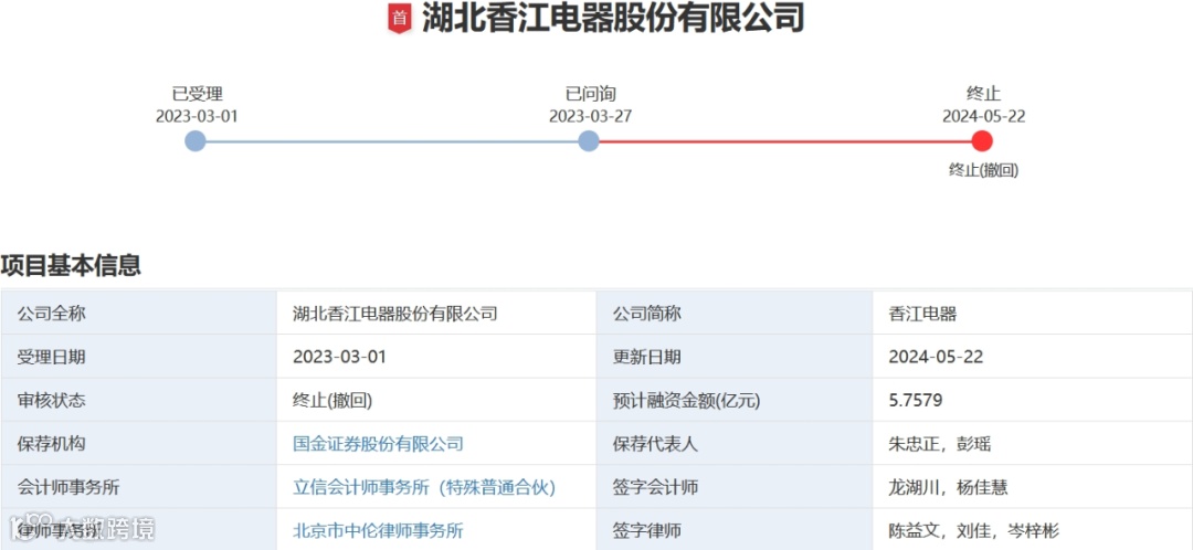 2024年5月22日,深交所官网公告,湖北香江电器股份有限公司(以下简称“香江电器”)撤回主板IPO申请。