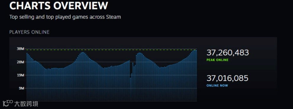 据 SteamDB 数据显示,全球最大的游戏平台 Steam 同时在线玩家数在8月25日突破了 3726 万,再次创下新的纪录。不过虽然同时在线人数高达 3700 万,但其中只有约 1400 万用户真正在玩游戏。