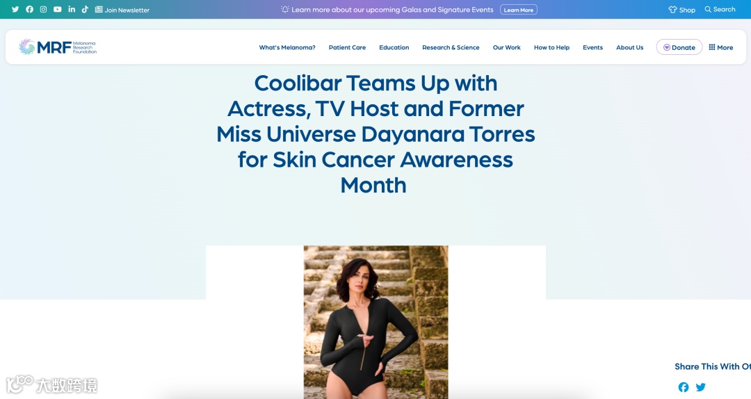 2025年5月,Coolibar 宣布成为美国MRF官方战略合作伙伴,并邀请Dayanara Torres作为品牌大使,联合发起「Coolibar–蓝色防护带」#CoolibarBlue 活动,旨在提升皮肤癌早筛与防护意识。