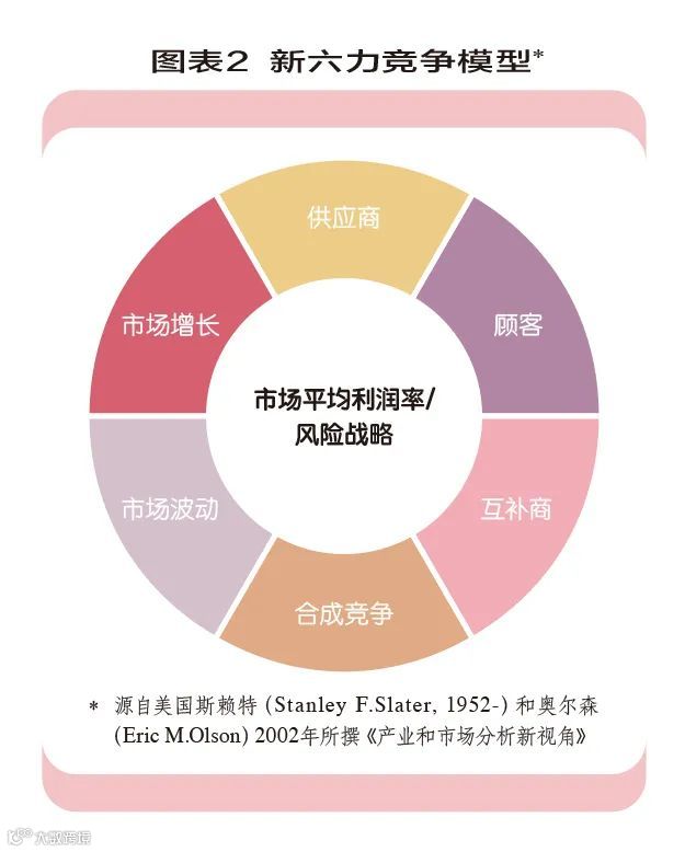 从管理学角度来看,结合新“六力模型”(如图表2所示),即市场是由六种力量,分别为供应商、顾客、互补商、合成竞争、市场波动、市场增长构成整体结构,并共同决定市场平均利润率。由于各家企业因自身资源和能力的不同,在同一市场结构中拥有不同的市场力量。据此,企业在制定竞争战略时,不应以关于市场结构的概括评估为依据,而应以企业自身的市场力量为基础。