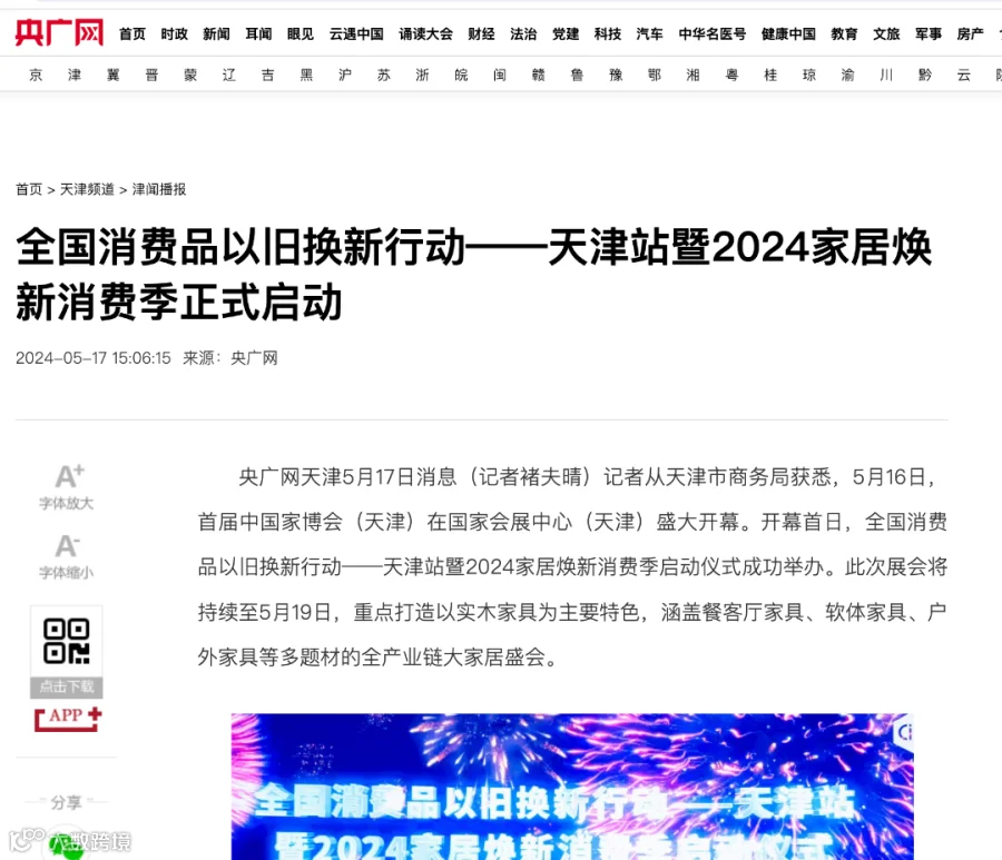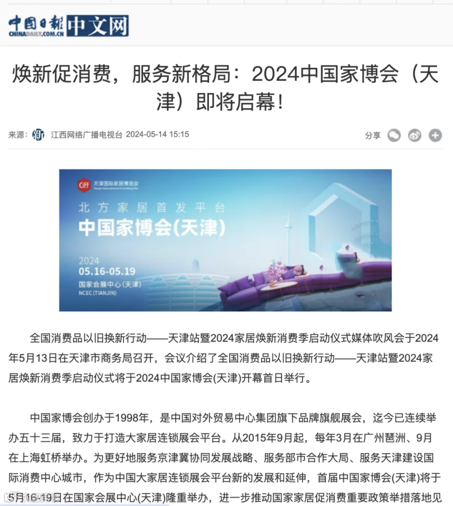 5月16日,全国消费品以旧换新行动——天津站暨2024家居焕新消费季启动仪式于中国家博会(天津)开幕首日顺利举行,旨在推动家居以旧换新,激发家居消费市场的新活力。