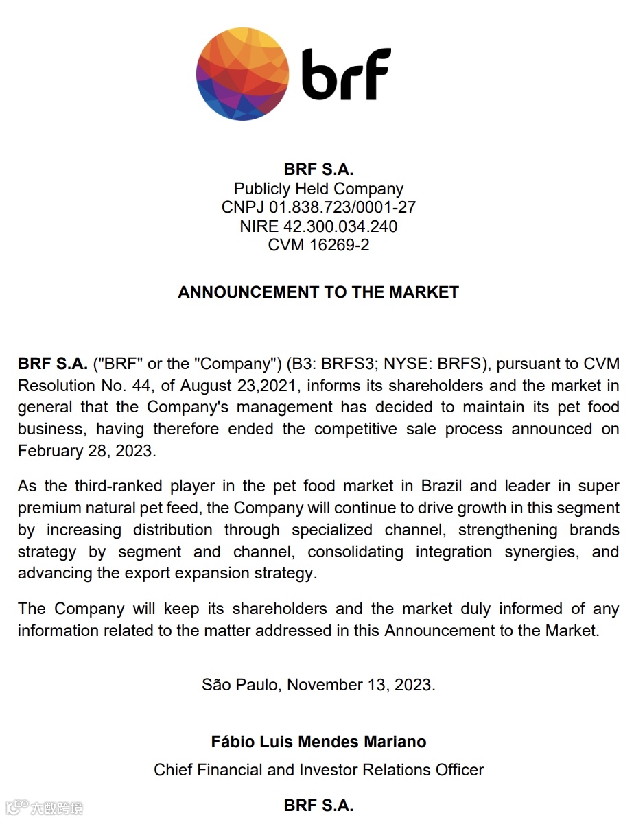 对于BRF不再出售宠物业务的原因,巴西Bradesco BBI投资银行的拉丁美洲食品、饮料和农业主管Leandro Fontanesi表示,不继续出售的决定可能是因为BRF没有收到符合其目标估值的出价。而这一决定也表明BRF致力于财务纪律,并不需要以低吸引力的估值清算资产来筹集现金。