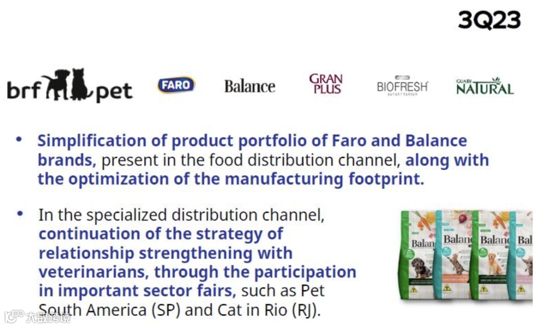对此,BRF也在第三季度财报中指出,BRF将继续推动宠物食品业务部门的增长。今年8月,宠物食品品牌Balance重新上线,优化了产品组合和品牌。并实现了在坎皮纳斯工厂生产,能够产生更积极的协同效应并增加潜力收益性。
