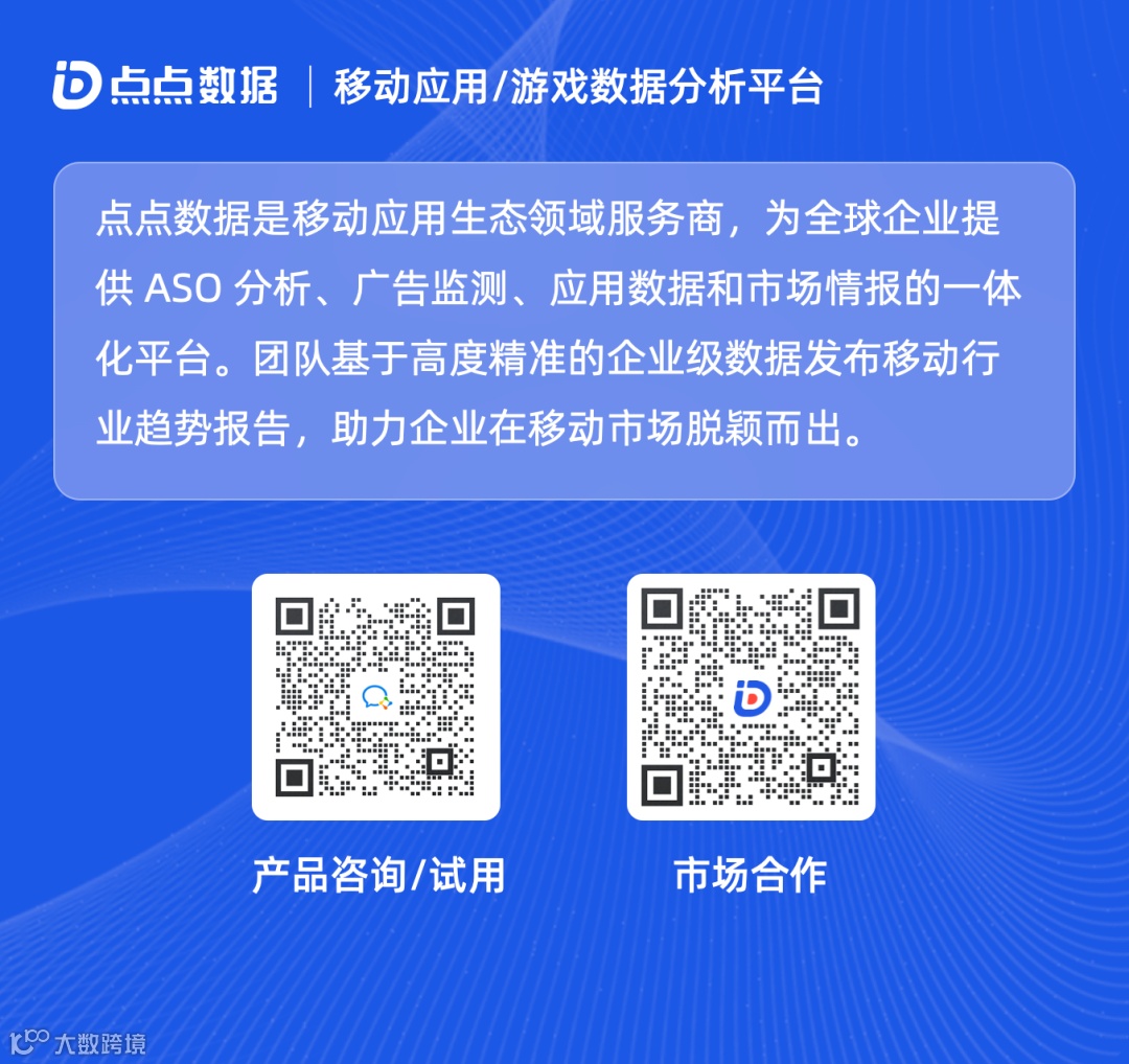 点点数据是归因(上海)科技有限公司旗下的游戏数据/移动应用分析平台,为全球开发者、营销人员、投资机构、数据媒体提供全面且准确的互联网大数据,平台支持全球APP下载/收入、用户行为数据查询和移动应用市场、主机游戏平台实时监测。