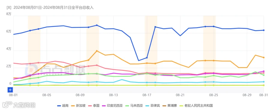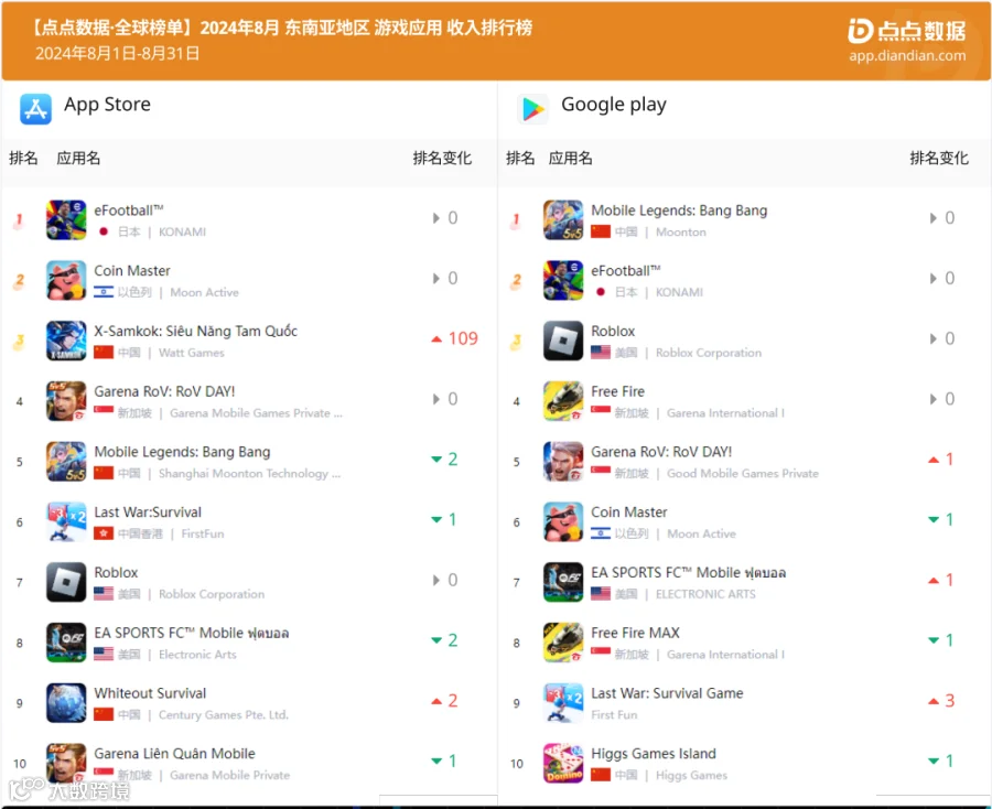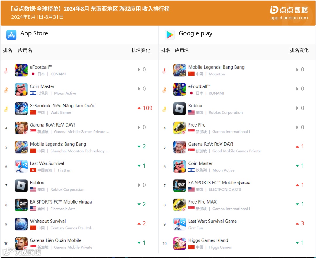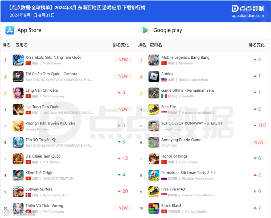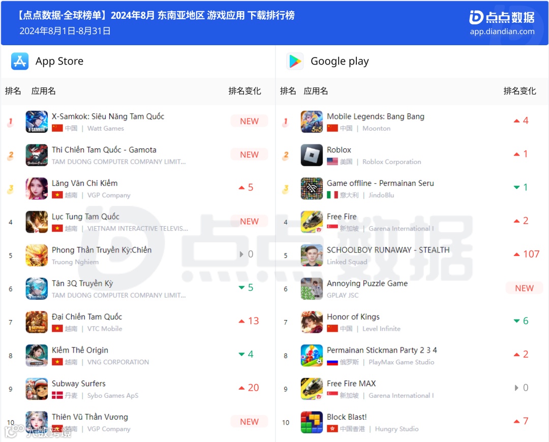 沐瞳旗下MOBA手游《Mobile Legends: Bang Bang》八月Google Play平台的下载数据回暖,凭借超过526万重夺东南亚地区手游下载冠军;4399旗下卡牌放置RPG《X-Samkok》空降东南亚地区App Store手游下载榜冠军;越南多款手游再次上榜。