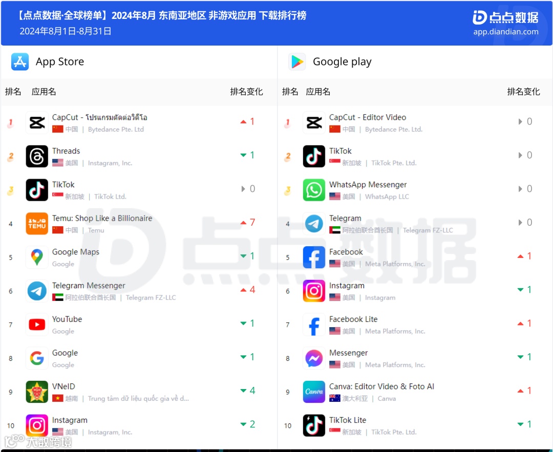 八月字节旗下视频剪辑应用《CapCut》再次以超1021万的下载量蝉联东南亚地区非游应用下载冠军并同时问鼎双平台下载榜;拼多多海外版《Temu》上月重返App Store应用下载榜前五。