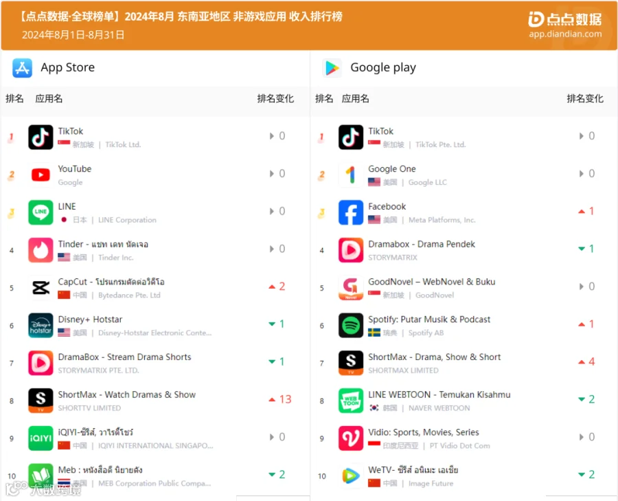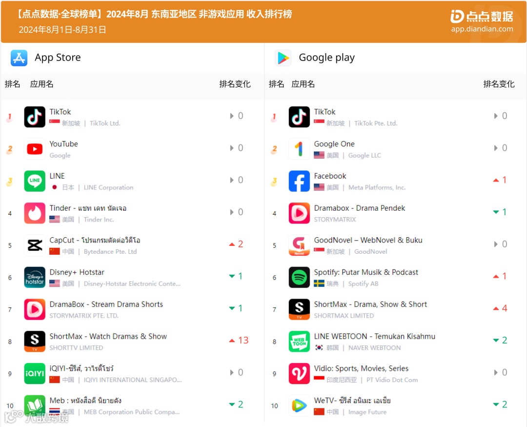 短视频社交应用《TikTok》双平台再次登顶并以超过1076万美元的预估收入蝉联东南亚地区八月应用收入冠军;九州文化旗下短剧应用《ShortMax》双平台预估月收入上浮明显,双双进入榜单前十。