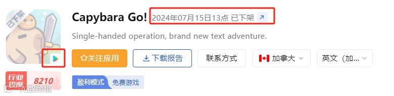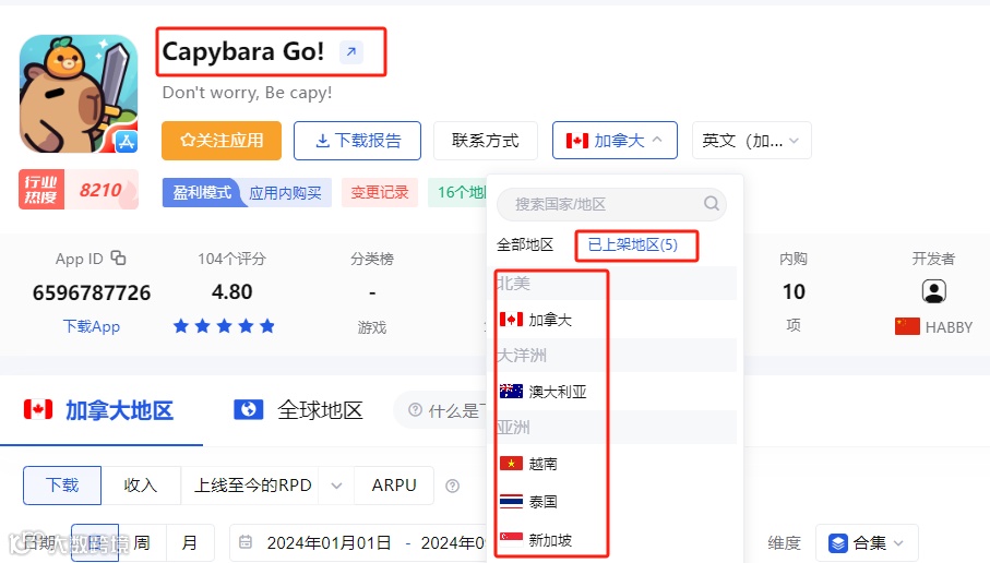 今年8月底,Habby旗下混合休闲游戏《Capybara Go!》登陆越南、加拿大、泰国、新加坡进行测试,9月初登陆市场又增添澳大利亚。
