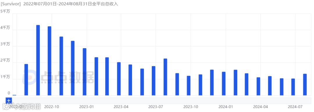 后者早在2020年10月下旬便开始测试,但直到2022年7月才正式上线,核心玩法结合了Roguelike元素和生存割草模式,当前登陆了168个国家及地区。《弹壳特攻队》2022年上线6个月便在全球收获了12.2亿元,去年虽然存在一定程度的下降,但年流水也有15.9亿,今年下滑趋势依然存在,但整体偏缓,月流水稳定在7000万至1亿元之间。