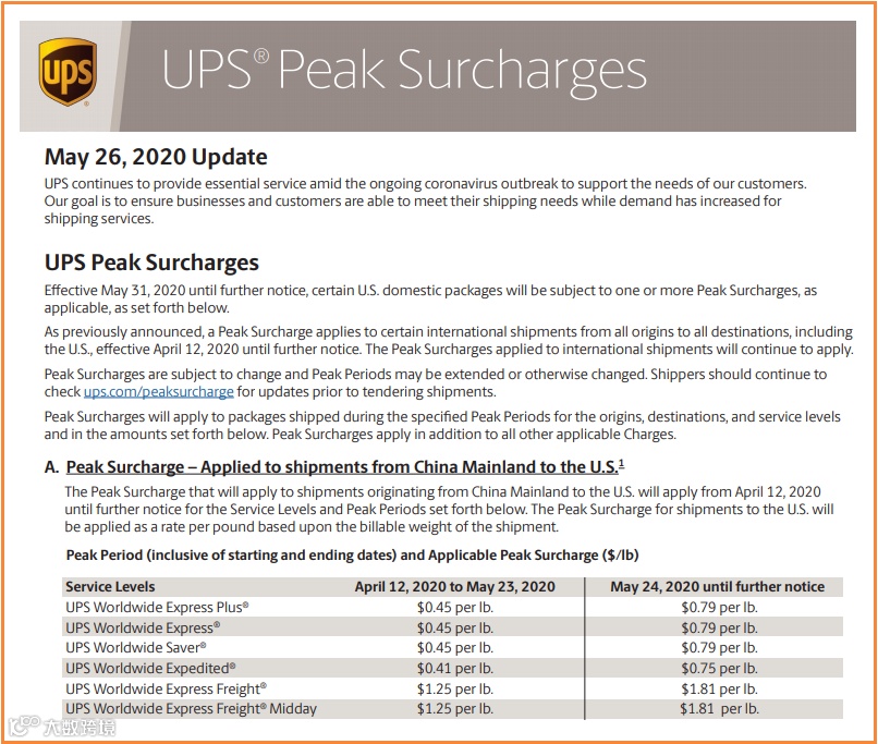 从5月31日起:UPS将对使用UPS Ground和SurePost服务的用户征收30美分/包裹的附加费。这项附加费针对二月份平均每周包裹量超过25,000个以上的寄件人征收;