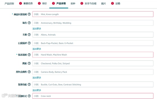 以连衣裙为例,“商品信息完善”(product enrichment)里面可以填写如下属性: