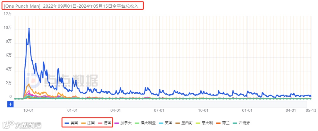 截至目前(5月14日,下同),《Watcher of Realms》公测正好10个月,近一个月流水达6360万,双端累计总流水预估为4.97亿元,美国、德国、法国以45.82%、9.45%以及5.1%的贡献居于前三,韩国、中国香港以及日本虽然上线不到两个月,但占比排名也已经分别来到了六、七、八名,收入趋势明显回暖。