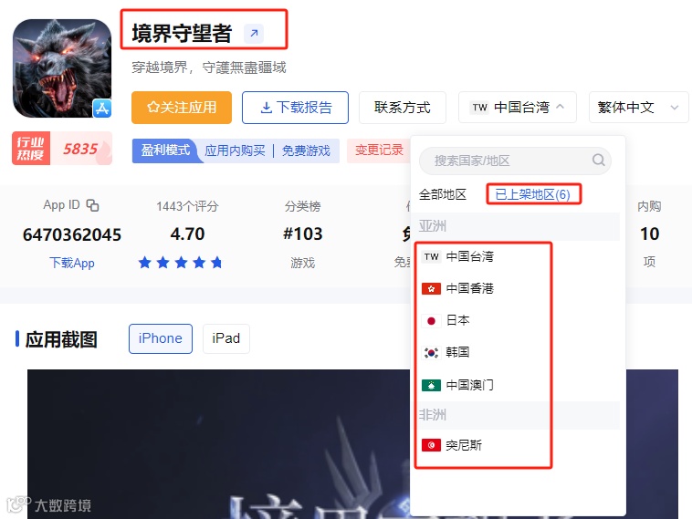 2023年7月14日,《Watcher of Realms》开启海外公测,登陆欧洲、美洲、大洋洲、非洲以及东南亚等区域的大部分(159个)国家及地区,截至上线前,海外预约量超250万。