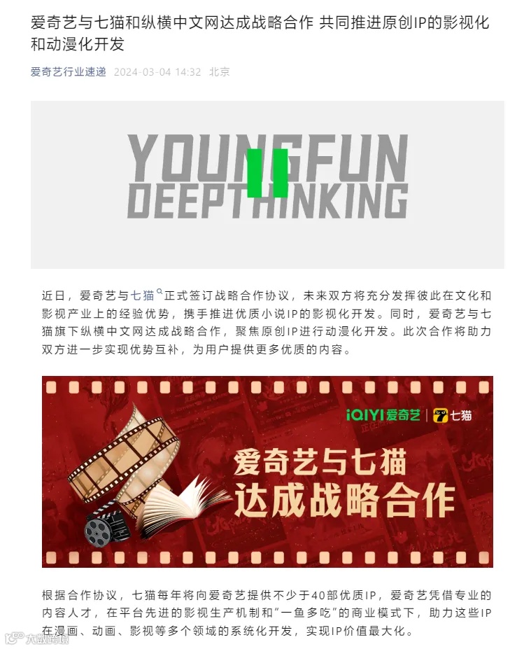 爱奇艺与七猫、纵横中文网合作,每年至少 40 部原创 IP 将迎影视化、动漫化