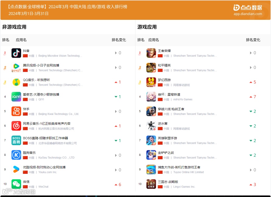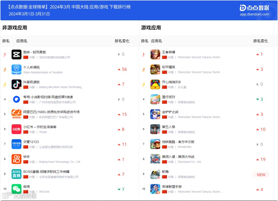 腾讯《王者荣耀》重归中国大陆手游下载冠军之位领衔腾讯旗下游戏重回榜单头部,三月App Store下载量超662万;FPS游戏《和平精英》同样回到榜单第二名;网易旗下除《蛋仔派对》排名滑落外,《第五人格》及新游《射雕》下载端表现尚佳。