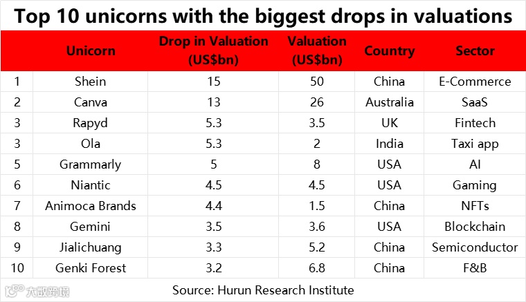 143家企业遭遇估值下调,52家“降级”至不足10亿美元。美国最多(19家)、中国次之(11家)。瑞典电池制造商Northvolt、中国电动车品牌合众(Hozon)跌幅最大;Shein缩水150亿美元,Canva下跌130亿美元,反映出私营估值的波动性和市场不确定性。