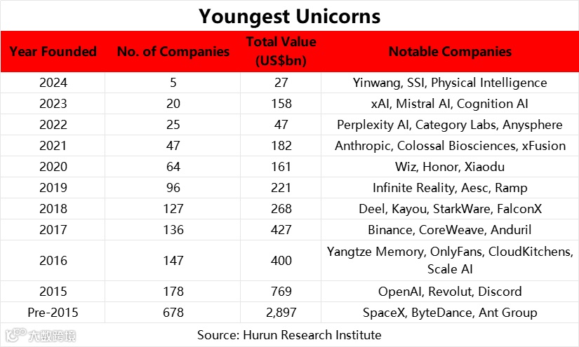 全球独角兽中有超过55%成立于过去十年内,合计估值达2.8万亿美元。令人瞩目的是,2024年创立的企业中已有五家达到十亿美元估值门槛,其中四家来自美国,一家为中国企业——Yinwang估值高达160亿美元。