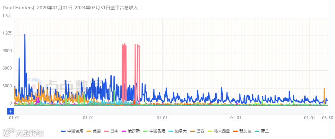 后者是乐狗继《万国觉醒》之后上线的新作,截至目前已经测满一年,海外总流水预估达9.03亿元,TOP3国家集中在美国、韩国及法国。宏观数据算是可观,但从趋势来看,作为一款SLG,《万龙觉醒》月流水处于持续下滑中,3月流水预估达4280万,仅有2023年4月1.31亿元峰值的三分之一,想要接班前作,道阻且长。