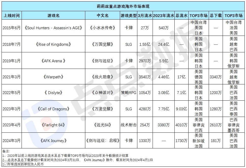 下文中,我们将详细分析《剑与远征:启程》的市场表现及游戏内容,同时根据下表拆解莉莉丝目前重点游戏的表现,以回答上述问题。