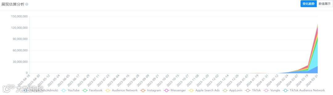 就投放侧来看,安卓端最早于2023年4月下旬开启投放,去年12月到今年1月底规模有小幅度提升,2月中旬整体量级再次缓步提升,公测前一周开始陡增,截至目前(3月31日,下同)其严格去重后广告达到4066,近两周投放占比为47%,YouTube、TikTok、Google Ads是TOP3投放平台。