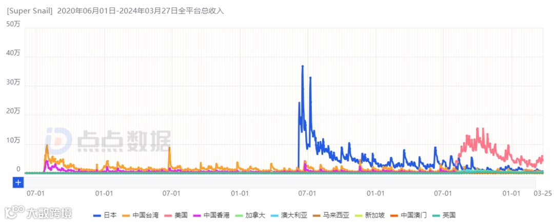 目前该作已经登陆全球130多个国家及地区,2022年6月之前繁体中文为主要的流水贡献市场,2022年7月至2023年8月日本提供主要收入增量,之后美国接过了持续创收的接力棒。2021年至2023年,其在海外的双端年流水分别为6066万、1.66亿、1.97亿,海外已经成为《最强蜗牛》新的增长方向。