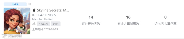 据广大大数据显示,《Skyline Secrets》目前仅在苹果端存在尝试性的投放,累计投放14天,严格去重后的相关广告创意为16。由于并没有开启大规模投放,因此该作的总下载量(5.5万)及累计流水(4000)处于低位便完全可以理解。