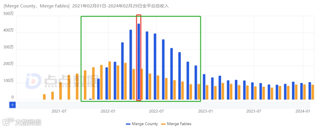 就在《Merge Fables》还处于收入持续增加的2021年11月中下旬,同为“合成+模拟经营”但加入了更多剧情的《Merge County》上线了。