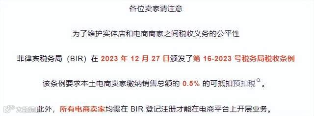 近日,Shopee菲律宾站发布公告,对所有卖家发出了提醒:为了确保实体店和电商商家之间的公平竞争,菲律宾税务局(BIR)已经正式颁发了新的税收条例,根据该条例的要求,菲律宾本土电商卖家必须要缴纳自己销售总额0.5% 的金额,作为可抵扣预扣税。与此同时,所有电商卖家都必须要在BIR完成登记注册,否则将不能开展业务。