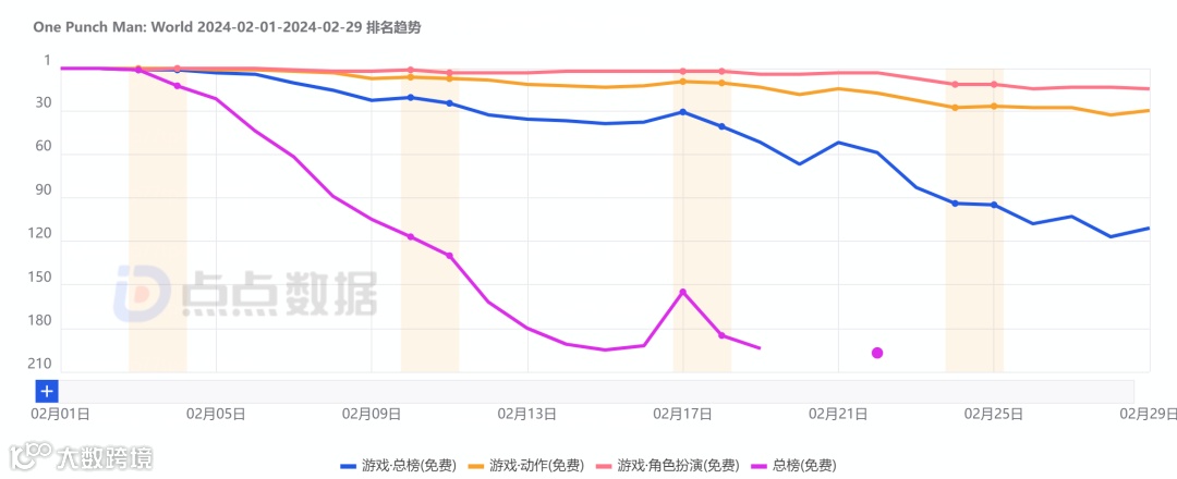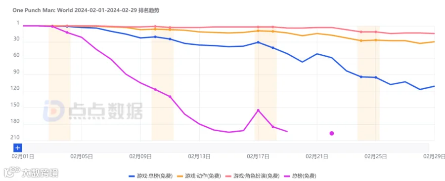由完美世界游戏旗下T3 Studio 研发,根据知名动漫作品《一拳超人》为背景打造的动作手游《One Punch Man World》(一拳超人世界) 于2月初正式在东南亚地区上线。根据点点数据统计,游戏上线当日便在多国应用市场免费榜总榜登顶,并持续霸榜所属类别游戏免费榜。与此同时,游戏上线首月在东南亚地区多国畅销榜的排名也能稳定在所属类别的20名左右。