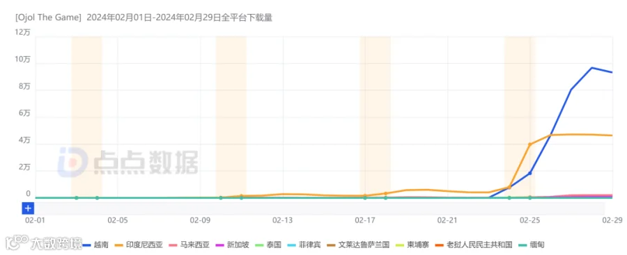 根据点点数据统计,《Ojol The Game》2月在东南亚地区的总下载量超过63万,越南、印度尼西亚贡献了超过95%的下载量。