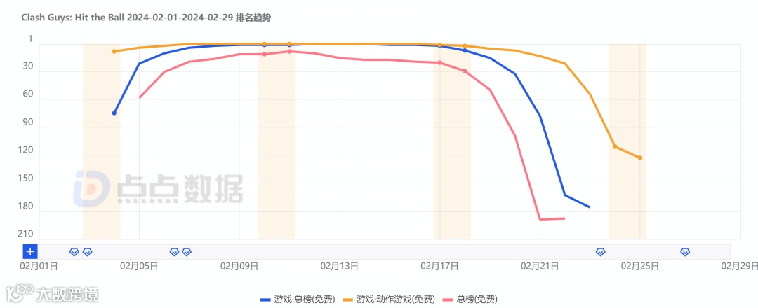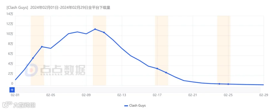 点点数据显示,整个2月《Clash Guys: Hit the Ball》共在东南亚地区取得超过130万的下载量。单游戏较为单一的玩法也使得热度峰值难以维系,下载趋势上来看由春节当天开始的数据滑落也反映了这一点。