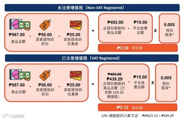另外,Shopee还公布了预扣税的计算方式。未注册增值税的卖家只需按照缴纳0.5%的预扣税,而注册了增值税的卖家则要先扣除增值税,再缴纳预扣税。
