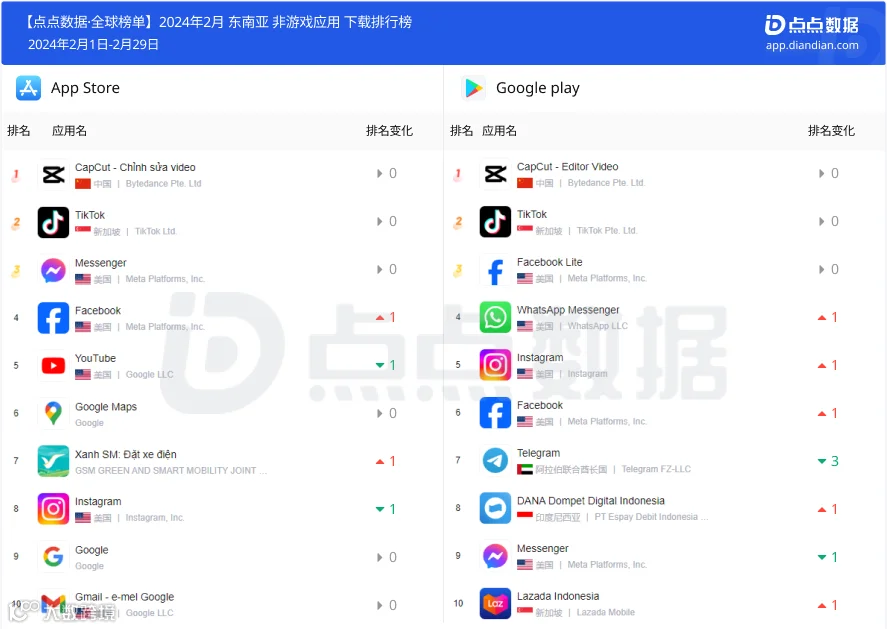 二月字节旗下视频剪辑应用《CapCut》下载量超991万继续蝉联东南亚地区非游应用下载冠军;Meta旗舰社交应用Facebook双平台下载量小幅回暖。