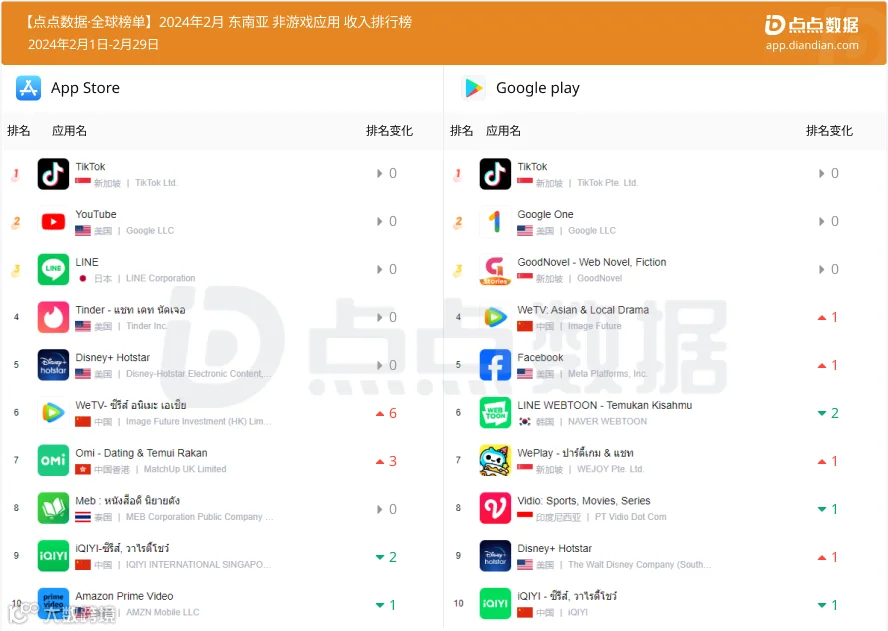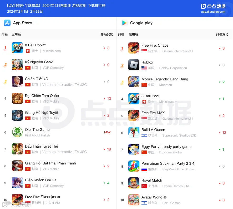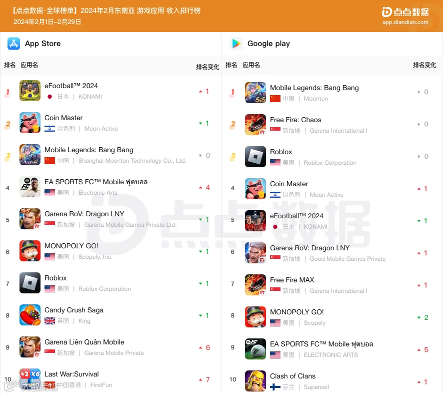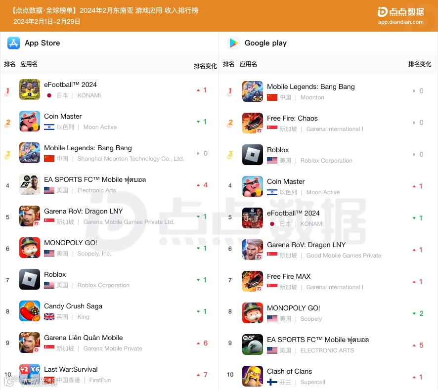 沐瞳MOBA手游《Mobile Legends: Bang Bang》二月以超过625万美元的预估收入蝉联东南亚地区手游收入冠军;科乐美与EA旗下两款足球手游《eFootball™ 2024》和《EA SPORTS FC™ Mobile》收入增幅明显。