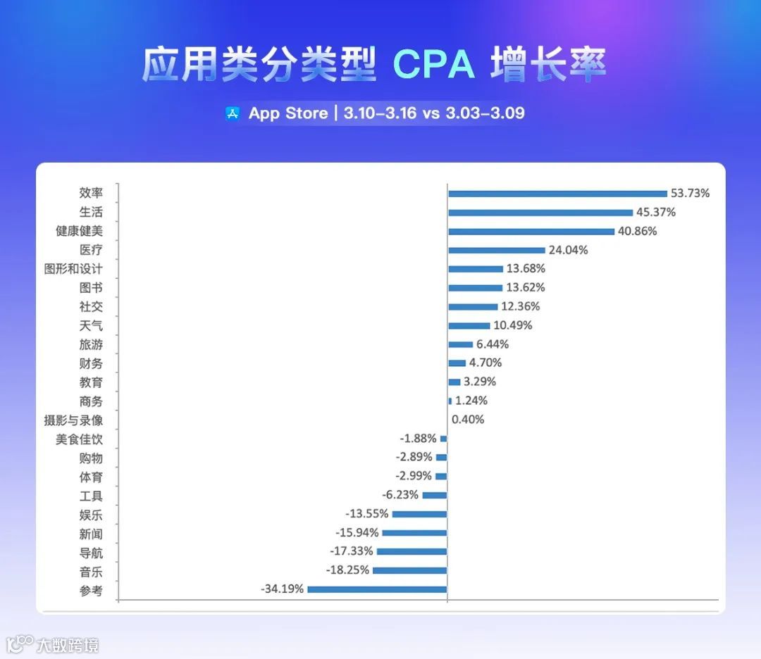 上周,效率类应用关键词 CPA 涨幅第一,为 53.73%,代表关键词有「微信分身」「 365日历」「现金巴士」等。参考类关键词 CPA 下降最多,为 34.19%,代表关键词有「计算机三级」「高考单招」「泰语」等。