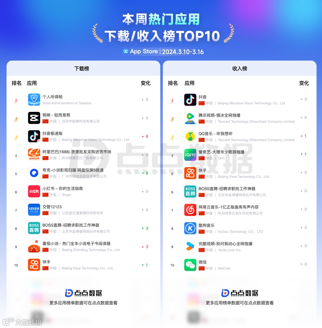 在上周的应用热门下载榜单 Top10 中前三名分别是「个人所得税」「剪映」「抖音极速版」,其中「抖音极速版」上升最快;应用收入榜单 Top10 中前三名分别是「抖音」「腾讯视频」「QQ音乐」,上升最快的是「QQ音乐」。