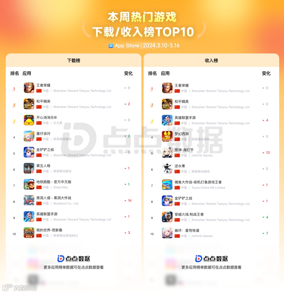 在本周的游戏热门下载榜单 Top10 中前三名分别是「王者荣耀」「和平精英」「开心消消乐」,其中「黑洞入侵-黑洞大作战」上升最快;游戏收入榜单 Top10 中前三名分别是「王者荣耀」「和平精英」「英雄联盟手游」,上升最快的是「原神」。