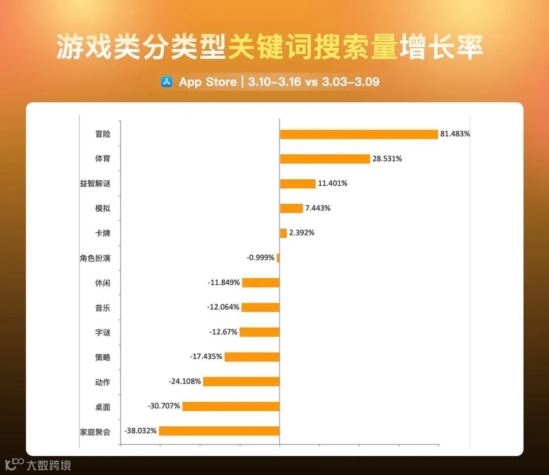 上周,冒险类游戏关键词搜索量增长最大,为 81.48%,代表关键词有「泰坦之旅」「公主连结」「元能失控」等。家庭聚会类游戏关键词搜索量下降最多,为 39.43%,代表关键词有「海滨消消乐」「喵喵大作战」「飞行棋」等。
