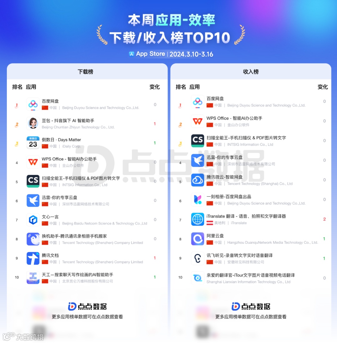 在上周的效率类应用下载榜单 Top10 中前三名分别是「百度网盘」「豆包」「倒数日」,其中「豆包」和「腾讯文档」上升最快;效率类应用收入榜单 Top10 中前三名分别是「百度网盘」「WPS Office」「iTranslate翻译」,上升最快的是「iTranslate翻译」。
