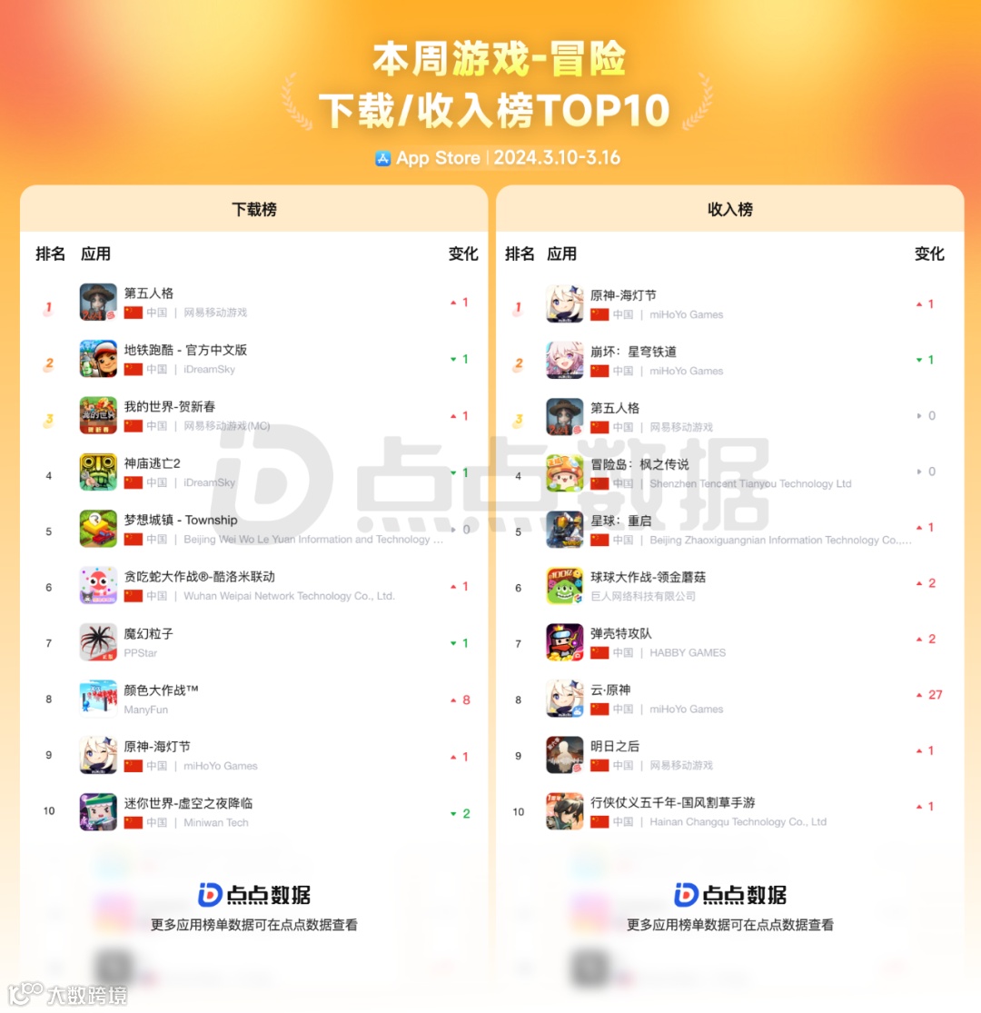 在上周的冒险类游戏下载榜单 Top10 中前三名分别是「第五人格」「地铁跑酷」「我的世界」,其中「颜色大作战」上升最快;冒险类游戏收入榜单 Top10 中前三名分别是「原神」「崩坏:星穹铁道」「第五人格」,上升最快的是「云·原神」。