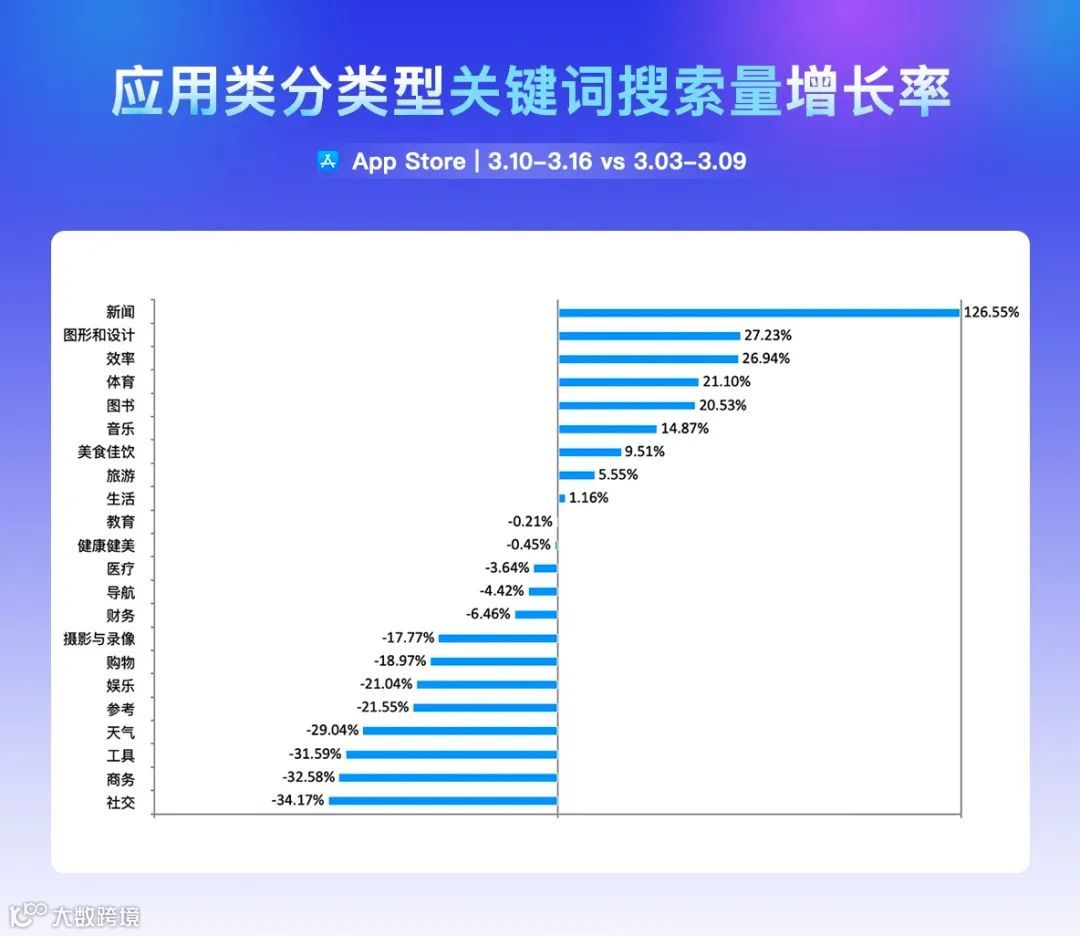 上周,新闻类关键词搜索量增长最大,为 126.55%,代表关键词有「新闻」「一点资讯」「中国日报」等。社交类关键词搜索量下降最多,降幅为 34.17%,代表关键词有「社区」「代号鸢」「新浪微博」等。