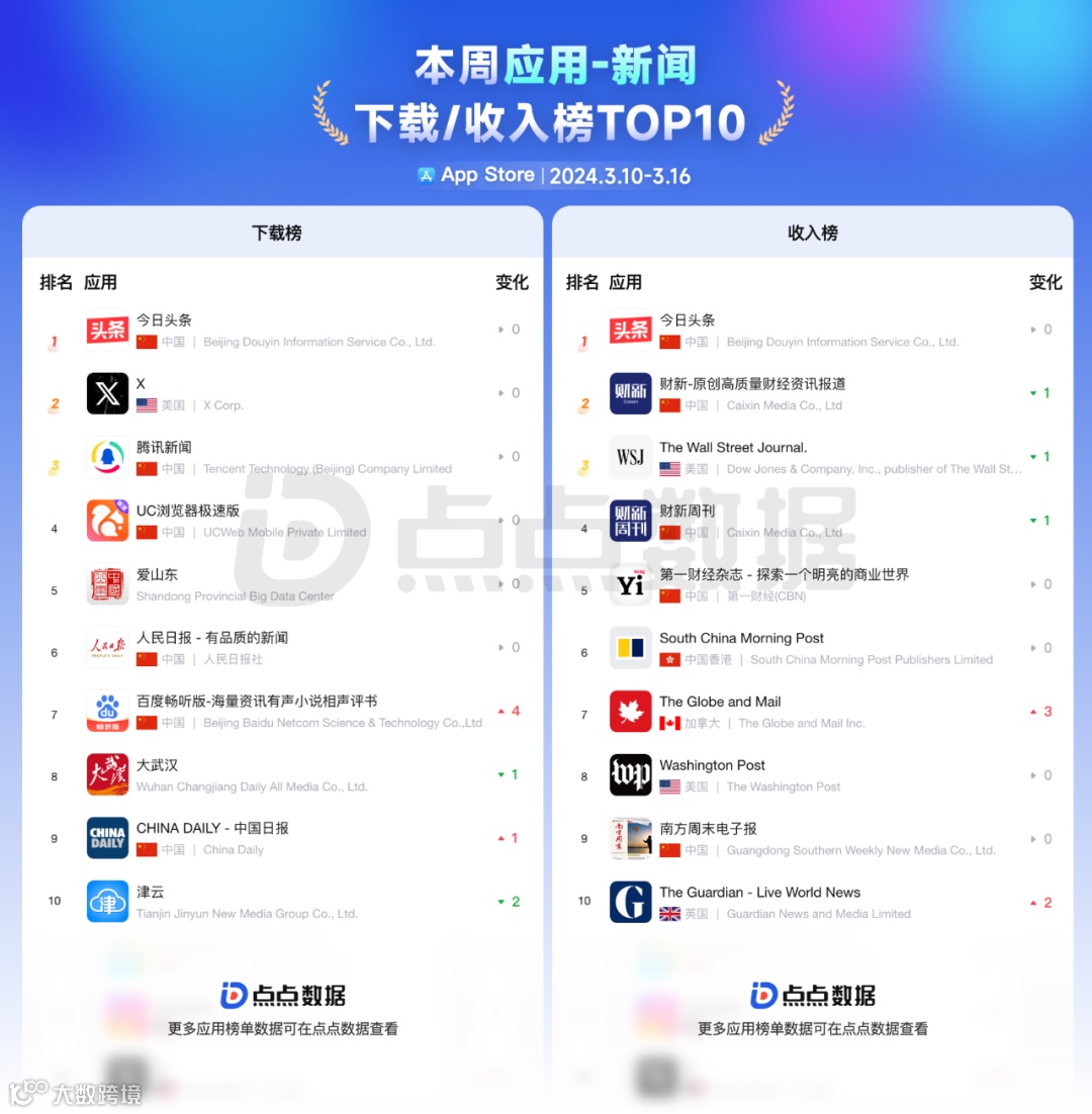 在上周的新闻类应用下载榜单 Top10 中前三名分别是「今日头条」「X」「腾讯新闻」,其中「百度畅听版」上升最快;新闻类应用收入榜单 Top10 中前三名分别是「今日头条」「财新」「The Wall Street Journal」,上升最快的是「The Globe and Mall」。