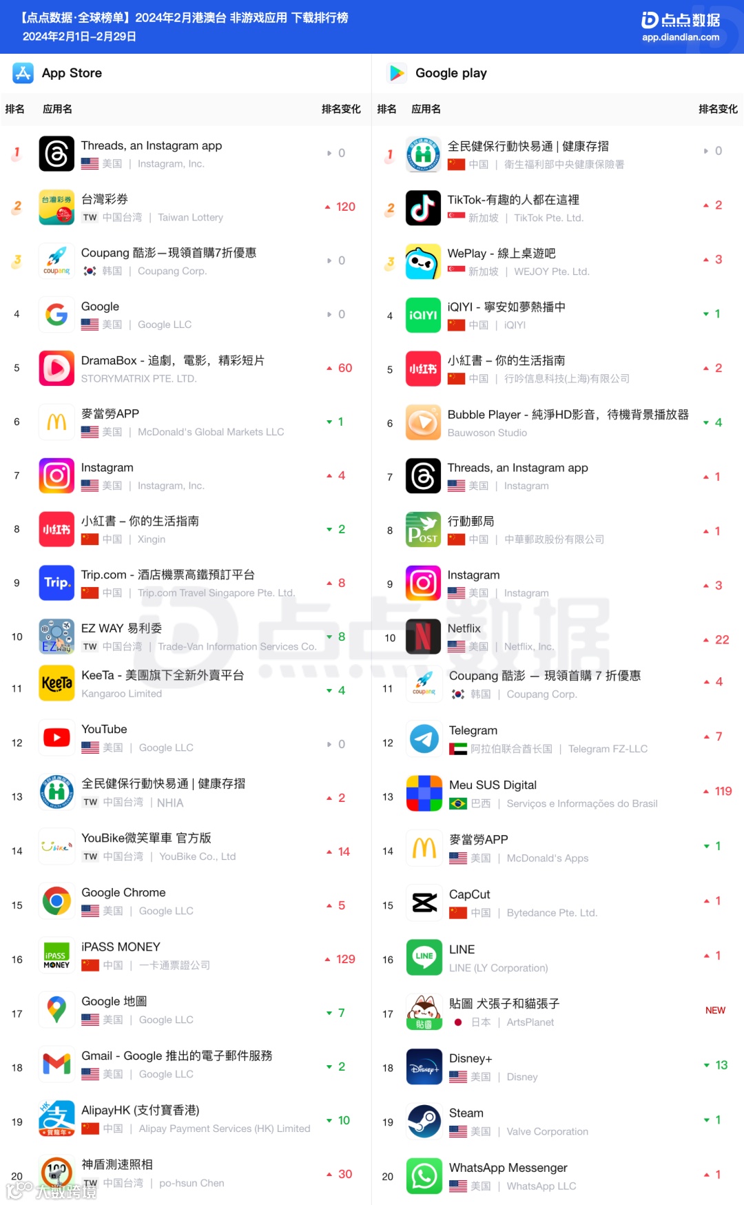 由于2月相对略短的统计周期,上榜应用下载量都有小幅下落,而Meta旗下文字社交应用《Threads》排名不减,其2月再次以超过47万下载量蝉联港澳台地区非游应用下载冠军。Google Play下载榜冠军同样由中国台湾地区民生医疗应用《全民健保行動快易通》持续蝉联,其单平台下载量稳定维持在10万以上。