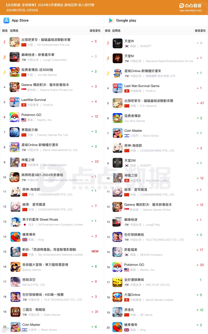 2月港澳台地区手游收入冠军再次由国产放置游戏《出發吧麥芬》接棒,其上月双平台预估总收入超过1501万美元(约RMB1.07亿元),这款心动自研的可爱治愈画风放置游戏在一系列高举高打的联动营销活动及买量策略的加持下继《菇勇者传说》后出圈,延续了放置游戏在港澳台地区的热度,也有望成为心动海外收入的新支撑点。Google Play这边则仍然由韩国NCSOFT旗下《天堂W》蝉联收入榜冠军。