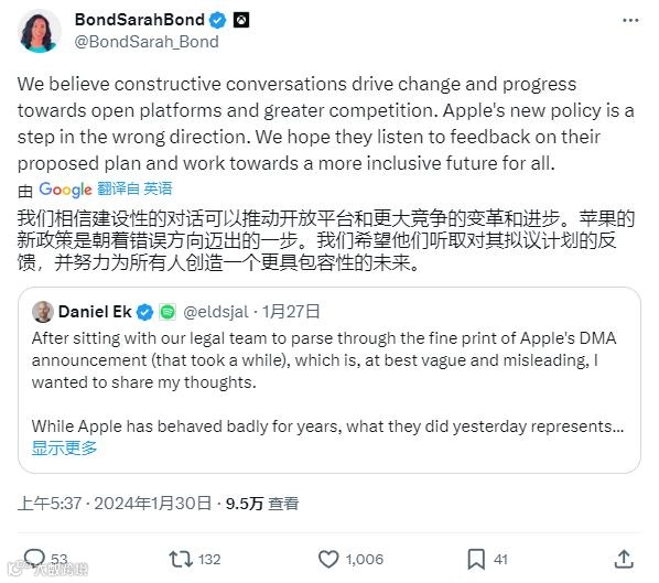 Spotify方面表示,公司在欧盟的用户数量达到1亿,每次安装0.5欧元的核心技术费可能让用户获取成本增加10倍。苹果新规是应付《数字市场法案》的“幌子”,是一场“彻彻底底的闹剧”,是“迫使开发者维持现状”。