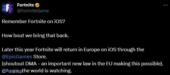 值得注意的是,虽然Epic Games 首席执行官Tim Sweeney将苹果新规称为“垃圾”,表示“苹果阻挠欧洲新数字市场法案的计划是一种狡猾的恶意合规行为”,但在新规宣布的第二天,《堡垒之夜》在X平台发文称将通过Epic Games Store重回欧洲iOS平台。